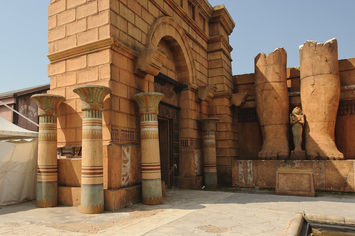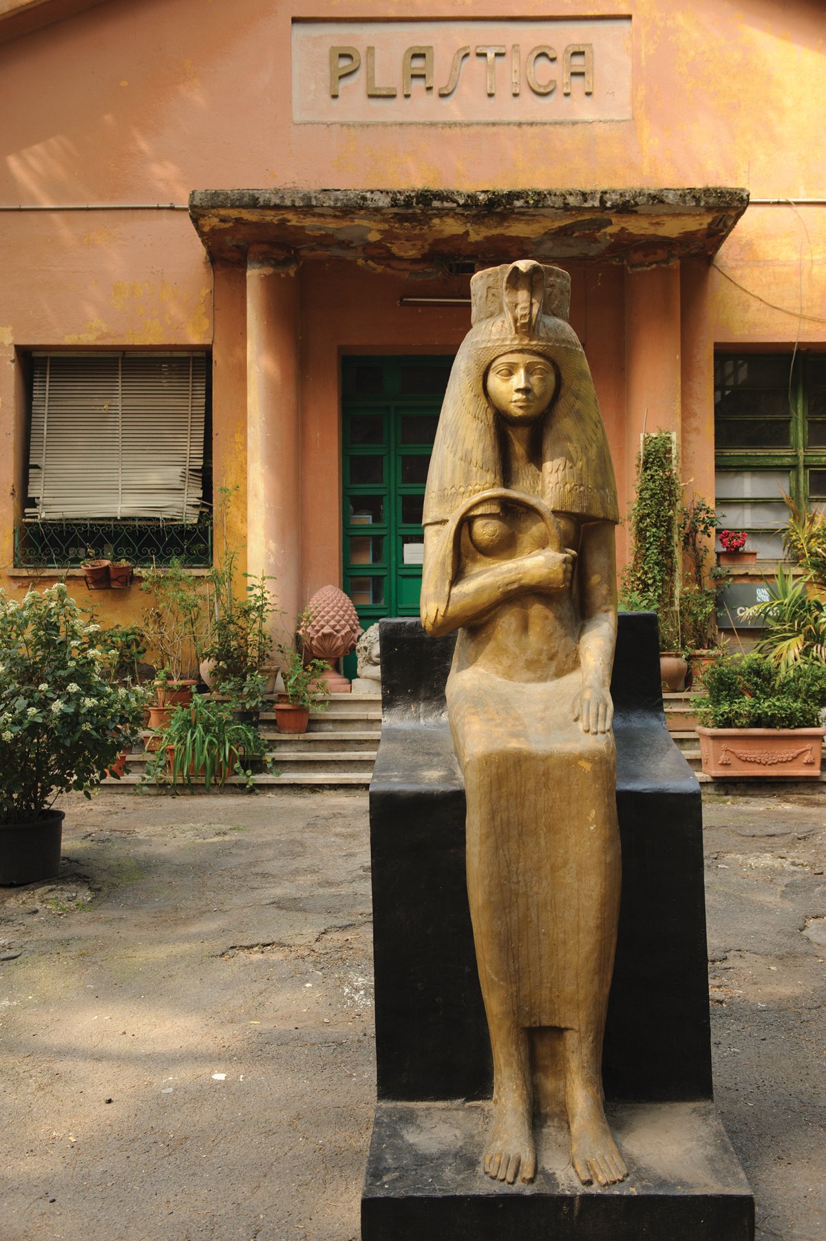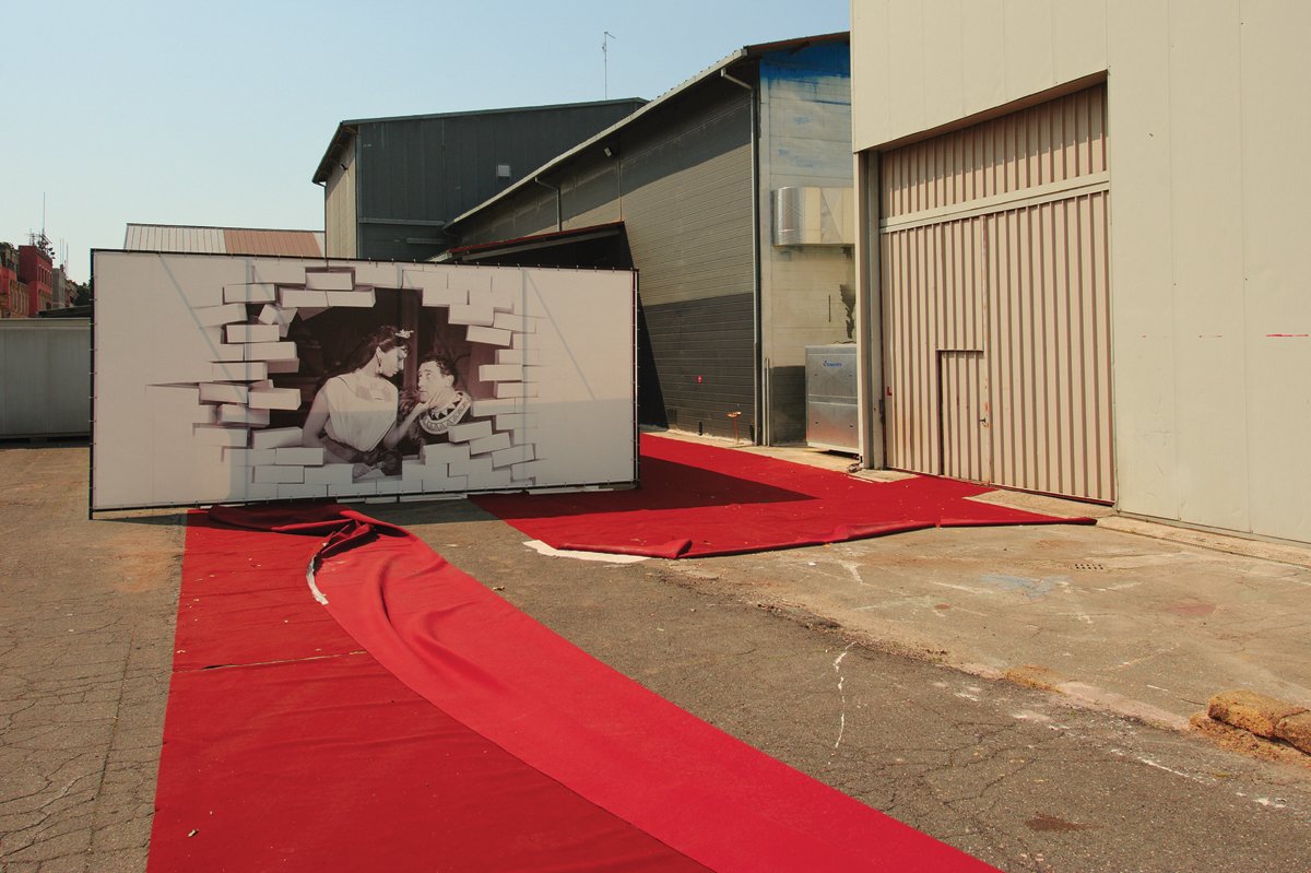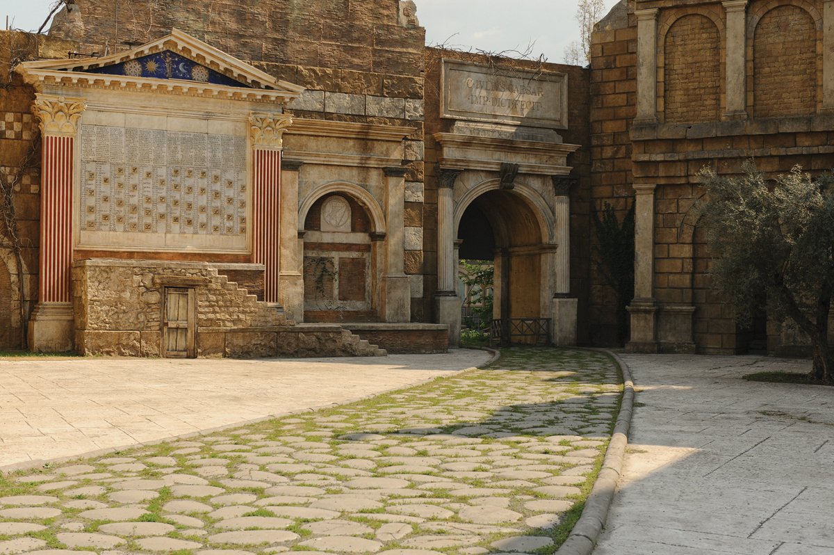 Emerging from the eponymous metro stop, Ancient Rome lies ahead only after passing through 19th century Downtown New York City – it’s Cinecitta. A Parisian alleyway is tucked behind an American street, a a modern warehouse sign appears behind an Egyptian edifice, a Franciscan Church adjacent the final hideaway for Romeo and Juliet. Bricks and mortar are actually wood and plastic. Painted sculptures defy dimension. . .but the videocamera obscures all that is congruent.