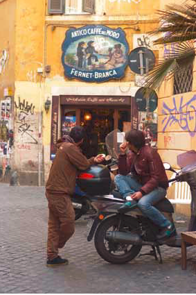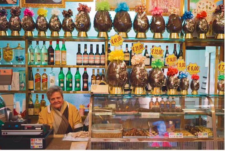 Meandering down the ancient cobblestones of Via del Moro, a pasticceria (sweet shop), plump chocolate eggs – and their Signora – preside during the Lenten weeks. Outside a nearby tavern, some men take in the street scene, using a motorino as a stoop.